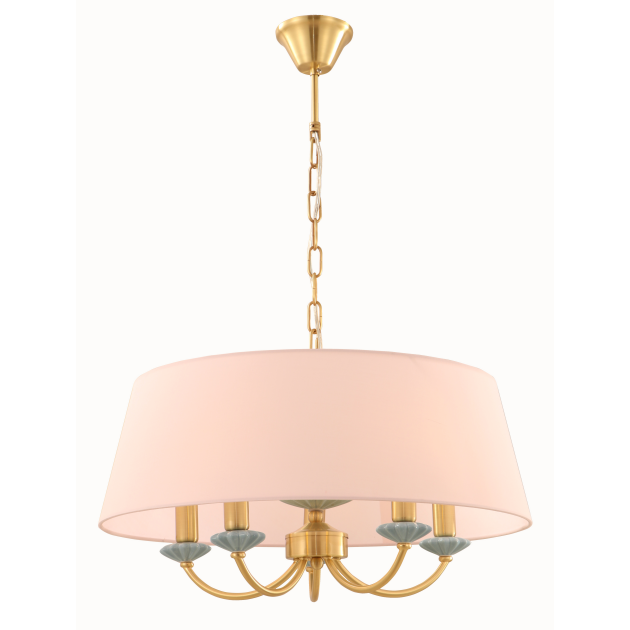 मजबूत प्रकाश पासून 5-हेड केज डिझाइन झूमर त्याच्या लक्षवेधी पिंजरा डिझाइनसह आधुनिक प्रकाशाची व्याख्या करते. पाच दिवा हेडपैकी प्रत्येक सागरी निळ्या सिरेमिक कपने सुशोभित केलेले आहे, एक मऊ, आमंत्रित चमक तयार करते जी तटस्थ आणि ठळक दोन्ही आतील भागांची पूर्तता करते. संपूर्ण फिक्स्चर एकाच ब्लश गुलाबी फॅब्रिक ड्रम शेडमध्ये गुंडाळलेले आहे, उबदारपणा आणि सुसंस्कृतपणा यांचे मिश्रण करते. वालुकामय गोल्ड मेटल फ्रेम, अँटी-रस्ट आणि स्क्रॅच-रेझिस्टंट फिनिशसह तयार केलेली, उच्च-आर्द्रता वातावरणातही दीर्घकाळ टिकणारी सौंदर्य सुनिश्चित करते.