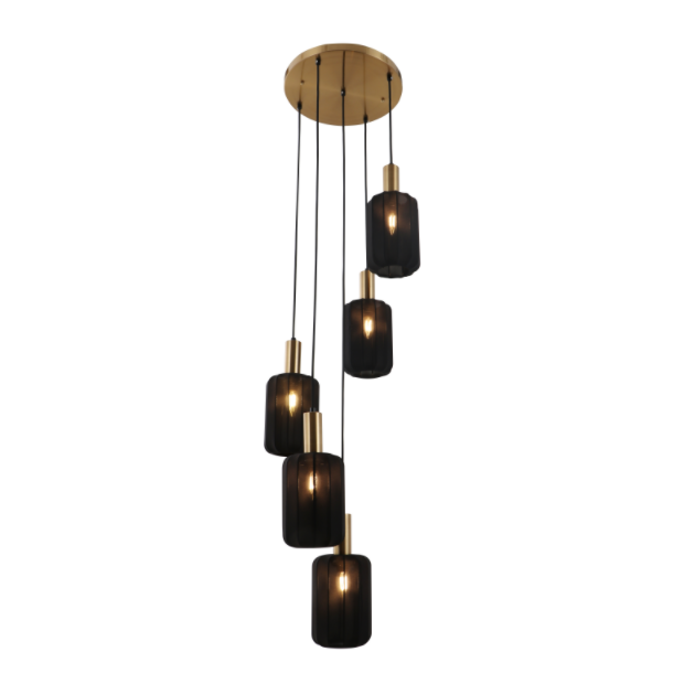 मजबूत लाइटिंगच्या पेंडेंट लाइटमध्ये 50 सेमी परिपत्रक कमाल मर्यादा प्लेटमधून पाच ड्रम-आकाराच्या काळ्या रेशीम-फॅब्रिक शेड्स टांगलेल्या उंचीवर टांगलेले आहेत. प्रत्येक सावली तांबे-फिनिश साखळ्यांद्वारे स्वतंत्रपणे समायोजित केली जाऊ शकते, ज्यामुळे टेबल्स, बेटे किंवा उच्च छतासाठी लवचिक कॉन्फिगरेशन होऊ शकते.