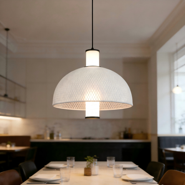 2025 च्या मिलान युरोल्युस प्रदर्शनातील अत्याधुनिक डिझाईन ट्रेंडपासून प्रेरित होऊन, स्ट्राँग लाइटिंगमधील हा मिनिमलिस्ट इटालियन सिल्क मेश लटकन दिवा व्यावहारिक कार्यक्षमतेसह इटालियन मिनिमलिझमचे अखंडपणे मिश्रण करतो. मध्यवर्ती 15W LED प्रकाश स्रोत 4000K तटस्थ प्रकाश उत्सर्जित करतो, ज्यामुळे आरामदायी वातावरण तयार होते. 1500LM च्या ब्राइटनेससह आणि Ra>80 च्या उच्च रंगाच्या रेंडरिंग इंडेक्ससह, प्रकाश नैसर्गिक आणि वास्तविक आहे, ज्यामुळे तो लिव्हिंग रूम, डायनिंग रूम आणि इतर जागांसाठी योग्य बनतो. गोलाकार कमानीच्या आकाराचा लॅम्पशेड पांढऱ्या रेशमी कपड्याभोवती गुंडाळलेल्या लोखंडी जाळीने बनलेला असतो आणि पोत जोडण्यासाठी स्प्रे पेंट प्रक्रियेसह मॅट ब्लॅक हार्डवेअर पूर्ण केले जाते. साधी रचना सहजपणे नॉर्डिक, आधुनिक आणि इतर घरगुती शैलींमध्ये समाकलित होते.